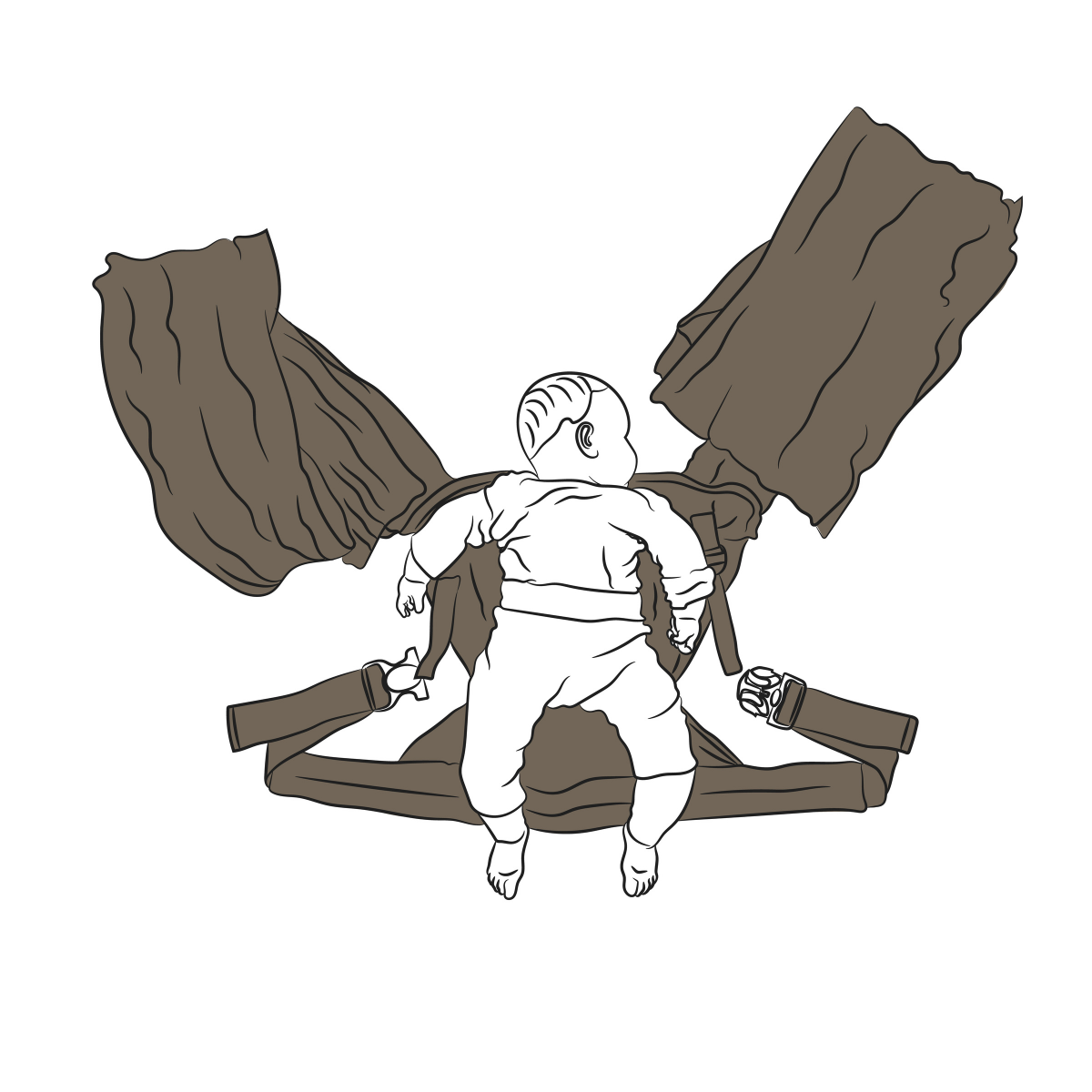 - Lift the body panel to the top of the baby's shoulders, through their legs. With one hand supporting baby, bring one strap over your shoulder then down and across your back.